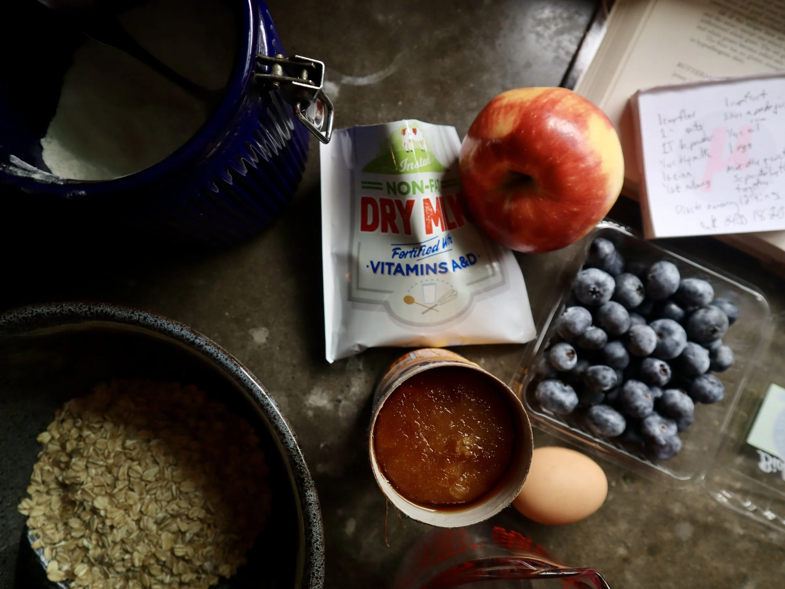 Note — these are not sweet muffins. All the sweetness comes from apple juice concentrate and that liquid is balanced by using dry milk powder. Also minimal on perishable items so these can be made at any time!