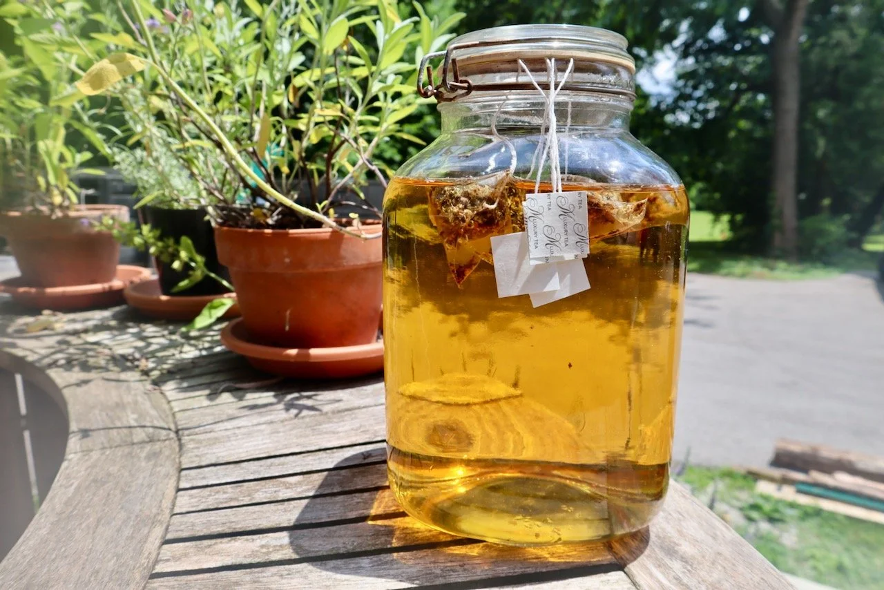 Add tea to a glass container like a gallon mason jar, fill ‘er up with water and place in the sunniest spot you can find on the hottest day.